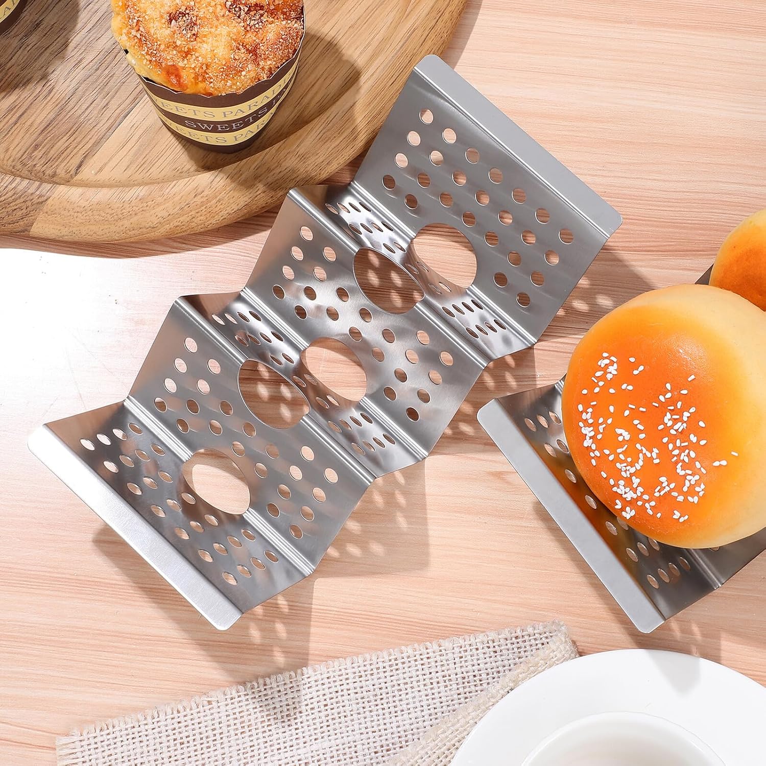 Package Include 8 x Taco Holders Features -Size: About21.70X10.00X5.00cm/8.53X3.93X1.97inches -Color:Silver -Material: Stainless steel -Product Info:Pizza stand -Made of stainless steel material, which isvery strong and safe and will not bend or deform. -There are many small round holes on eachside of the taco stands, which can heat up rapidly taco hold stand. taco serving dishes -Perfect for hosting family gatherings,fast-moving restaurant kitchens, and holiday parties Taco Stands for Parties. -Taco holders can be used to placeburritos, tortillas, hot dog pancakes, and more food taco holders for oven. -They will keep the tortillas upright, whether they are putting on plates or baking in the oven stainless steels taco holder.Goods Informationtaco serving tray for parties The weldingprocess is stable and strong.individual taco holders The taco holders are made of stainlesssteel, sturdy and wear-resistant.Taco Stands Stainless Steel Designed to keep your food upright andbeautifully presented.taco holders Whether you're having a party or simply cooking dinner,your delicious Mexican-style food will look perfectly portioned