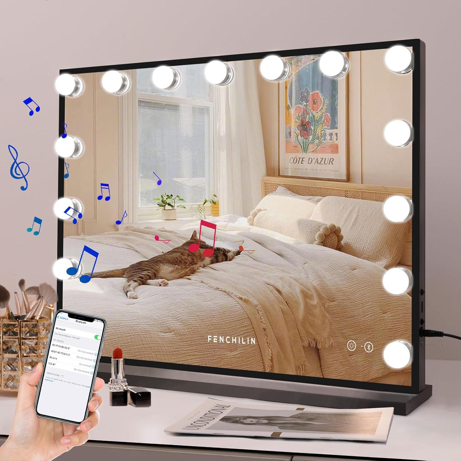 • 【Makeup Mirror with Lights & Bluetooth Speaker】FENCHILIN light-up vanity mirror is designed with 15 long-life G35 LED bulbs, making the makeup area brighter and your makeup application easier. With a built-in Bluetooth speaker, this vanity mirror is more than just a tool for makeup; it allows you to listen to music, watch makeup tutorials, and make calls during your makeup routine.
