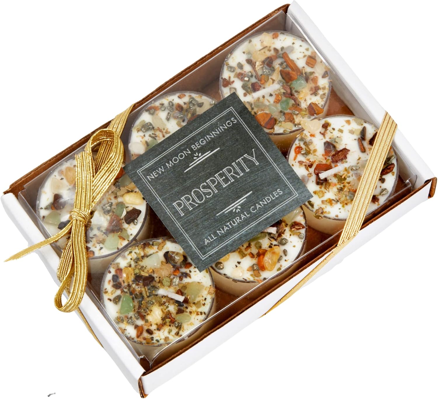 Our Prosperity Candle is made to call abundance into your environment and your life! Turn things around and promote encouragement to someone you love. Created to help with Good Luck and Success, the Prosperity Candle has a Pine, Woody, and Fresh scent with Pyrite, Citrine, Green Aventurine, and Tigers Eye healing crystals on top. Handmade and Hand-poured with Soy Wax for a Long, Clean Burn!This listing is for a single (1) New Moon Beginnings Candle container or pack of tealights. New Moon Beginnings Candles are Handmade and Hand-poured in the USA. We use 100% Natural Soy Wax, Essential oils, Natural Fragrance Oils, and 100% Cotton Wicks (Lead-Free). Each candle is topped with Genuine Crystals and Stones, flowers, and herbs which are all mindfully selected to help set the intention of the candle.Size Options include: Tealights in a set of 6: Each Tealight is .75" tall and 1.5" in diameter7.5 oz. Glass Jar: 3 inches high and ~2.75 inches in diameter8 oz. Tin with lid: 2 inches high and ~3 inches in diameter12 oz. Glass Jar with lid: 3.5 inches high and ~3.25 inches in diameter21 oz. Glass Jar with lid: 6.25 inches high and ~3 inches in diameterBURN TIMES: Tealights: 4 to 6 hours per tealight7.5 oz: 20 to 30 hours8 oz: 20 to 30 hours12 oz: 40 to 60 hours21 oz: 80 to 100 hours
